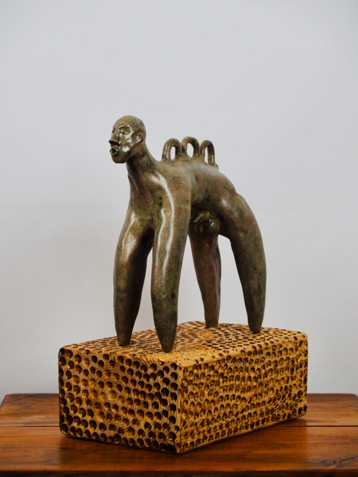 Keramická socha která proběhla dekonstrukcí, měděná glazura, dřevěný podstavec